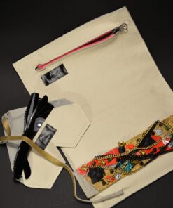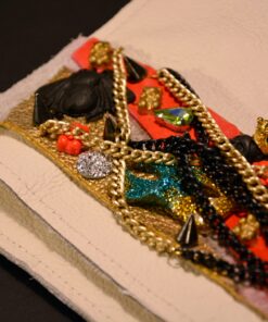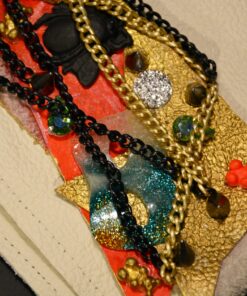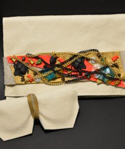 Ainueksemplarist originaallõikega käekoti komplekt on kaunistatud biovaidust valatud maskide ja mesilastega ning viimistletud mätsiva neoon roosa lukuga.