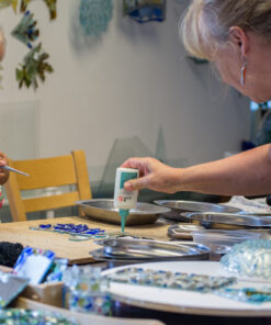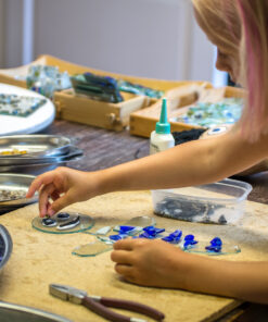 Taaskasutatud klaasist piltide, tarbeesemete ja kausside valmistamine. Õpime klaasi lõikama, tükid asetatakse ahjuplaadile, kinnitatakse liimiga ja kaunistatakse värviliste pudelikildudega. Kausi valmistamiseks kasutame keraamilist vormi, mille järgi klaas kooldub. Laste kasutuses on ohutud väikesed värvilised pudelikillud, millest nad saavad teha mosaiigi põhimõttel pildikesi. Seejärel lähevad tööd ahju ja 800 kraadi juures sulab klaas kokku. Tööd saab kätte alates ülejärgmisest päevast kuni nädala jooksul.